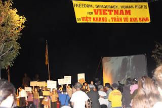 WESTMINSTER (NV) - Ðông đảo đồng hương có mặt tại Tượng Ðài Chiến Sĩ Việt-Mỹ vào tối Thứ Hai để hòa cùng giới trẻ và các hội đoàn ở miền Nam California tổ chức thắp nến, biểu tình phản đối, và xem tường trình trực tiếp phiên tòa xét xử hai nhạc sĩ Việt Khang và Hoàng Nhật Thông (tên thật là Trần Vũ Anh Bình) của nhà cầm quyền Việt Nam phát đi từ Sài Gòn.